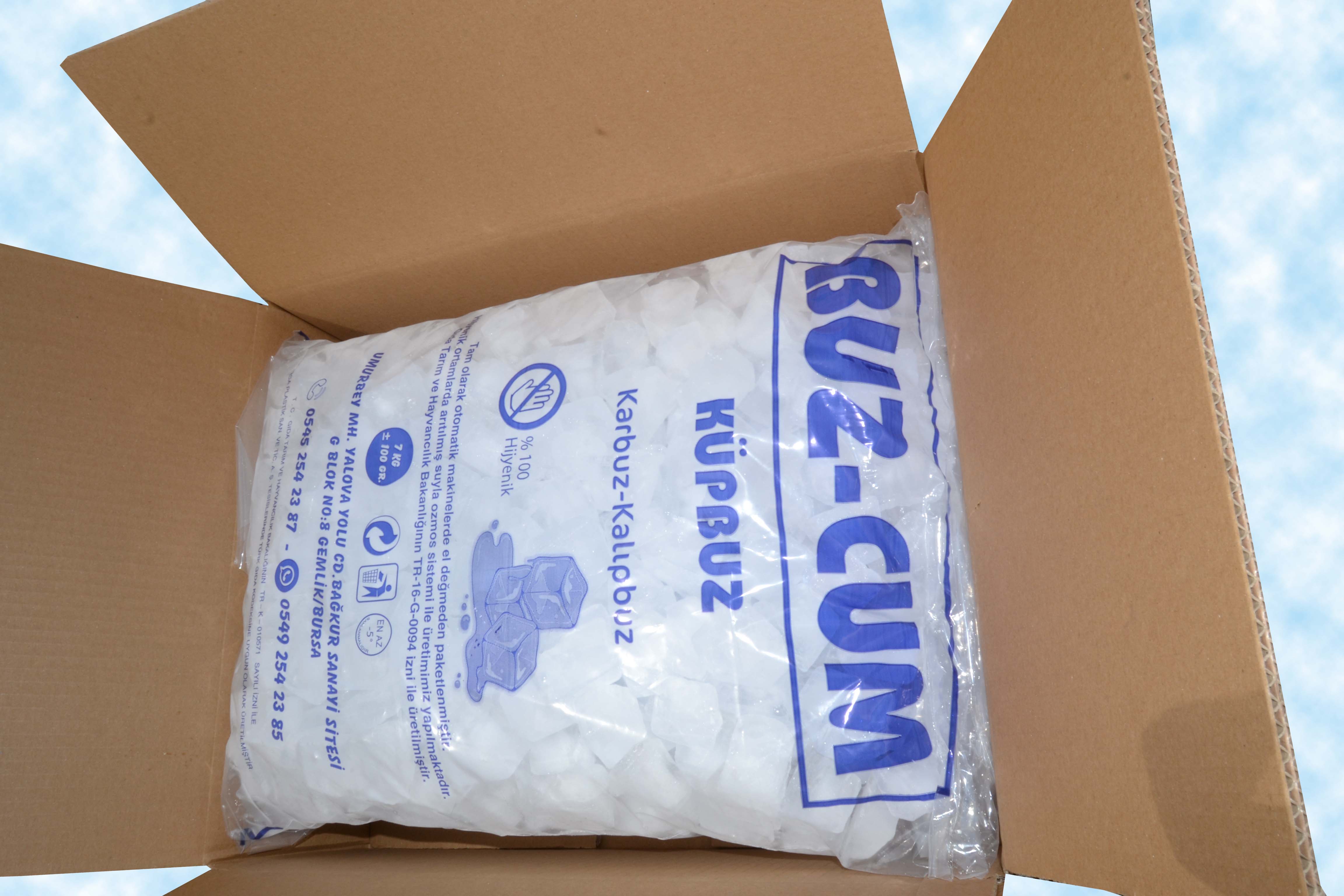 Küp buzlarımız; 24 adet 500 gramlık kolide 12 kg. ve 2 adet 7 kilogramlık kolide 14 kg. steril ambalajlarında,